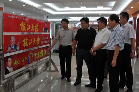 枝江酒業(yè)黨委書記張華(左一)向趙市長(左三)介紹枝江酒業(yè)不同發(fā)展階段的形象代言人8月27日,黑龍江省綏化市委常委、常務副市長趙萬山一行…