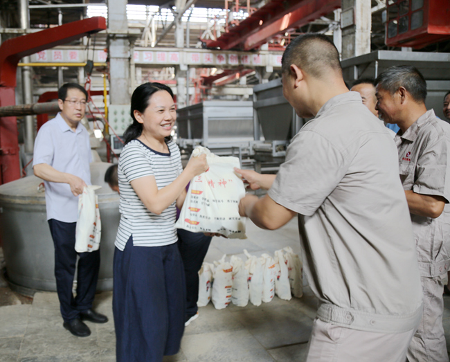 三伏盛夏,熱浪侵襲。8月2日,市政協(xié)黨組書記、主席黃丹梅來到車間,為奮戰(zhàn)在一線的釀造和搬運工人送來沐浴露、洗手液、洗衣液、毛巾、牙膏等…