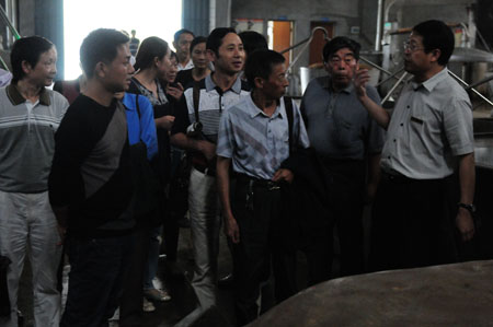 在枝江酒業(yè)黨委書記張華的熱情陪同下,來自問安小學(xué)的教師們參觀了歷史文化展廳、產(chǎn)品展示廳、5萬噸灌裝中心及釀造五車間,深刻了解了枝江酒業(yè)悠久的歷史文化背景,親身感受了酒香四溢、蒸汽環(huán)繞的釀酒場面,品嘗了新釀的熱氣騰騰的枝江原酒。特別在歷史文化展廳,老師們看到栩栩如生的關(guān)廟山模型,感到特別熟悉和親切,因為關(guān)廟山遺址與問安小學(xué)近在咫尺。“不身臨其境,感受不到枝江酒釀造的神奇?!痹趨⒂^了釀造五車間之后,一名老師深有感觸地說道。在枝江酒業(yè)多功能廳,老師們還觀看了枝江酒業(yè)社會扶貧宣傳片“心與力的行走”,認(rèn)真、全面地了解了枝江酒業(yè)人的社會責(zé)任擔(dān)當(dāng)和人文關(guān)懷。臨別,盛德剛校長還代表問安小學(xué)向枝江酒業(yè)贈送了“百年枝江,薪火相傳”的書畫作品,他表示,從枝江酒業(yè)的釀酒文化中,受到了觸及心靈的啟發(fā),他們會把這種奮發(fā)向上的精神帶回學(xué)校,植根在孩子們的心靈中。