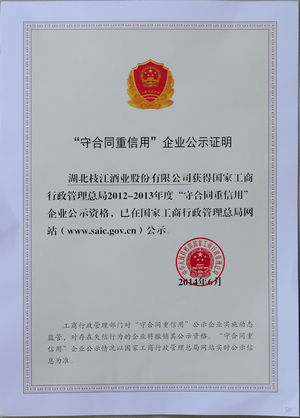 1月20日,宜昌市工商局、枝江市工商局領(lǐng)導(dǎo)為枝江酒業(yè)送來“國家工商行政管理總局2012-2013年度守合同重信用企業(yè)”、“湖北省2012-2013年度守合同重信用企業(yè)”2項榮譽證書。這是枝江酒業(yè)繼2010-2011年度后再度被授予該稱號。國家級守重企業(yè)是全國企業(yè)信用評價的最高榮譽,也是枝江酒業(yè)繼2014年11月被湖北省人民政府表彰為省級“守合同 重信用”示范企業(yè)后,獲得的又一項重量級榮譽。