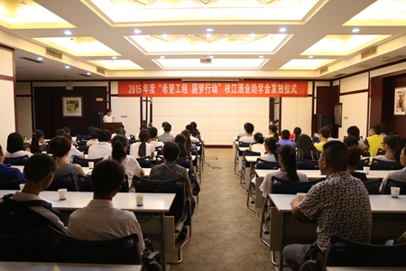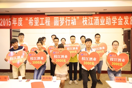 8月25日,由枝江酒業(yè)股份有限公司、共青團枝江市委共同主辦的2015年度“希望工程?圓夢行動”枝江酒業(yè)助學(xué)金發(fā)放儀式在枝江國酒舉行。市委常委、宣傳部部長黃丹梅,枝江酒業(yè)股份有限公司黨委書記張華等出席儀式。在活動現(xiàn)場,枝江酒業(yè)為枝江市100名家境貧寒、成績優(yōu)異的準(zhǔn)大學(xué)生發(fā)放30萬元助學(xué)金。來自顧家店鎮(zhèn)受助學(xué)生代表王慧玲說:“感謝各位領(lǐng)導(dǎo)和枝江酒業(yè)對我的幫助,在以后的學(xué)習(xí)和生活中,我會更加努力奮進,待我學(xué)有所成,定會回饋社會,幫助那些同樣需要幫助的人,讓這份愛心繼續(xù)傳遞下去。”