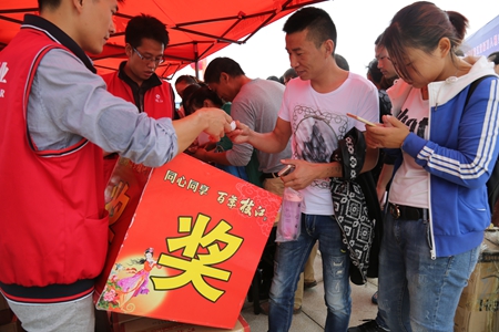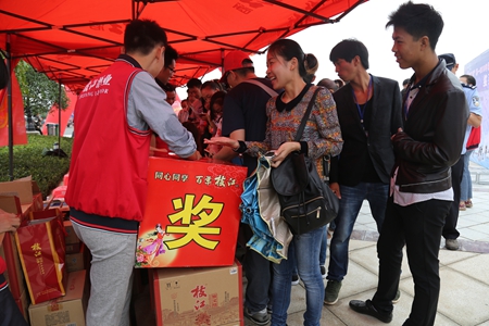 枝江酒業(yè)借用這樣的熱鬧場面,在相親活動現(xiàn)場進行微信掃碼贈酒活動,吸引了前來參加相親活動的各階層人士。在現(xiàn)場展示的產(chǎn)品有枝江王、百年枝江韻系列產(chǎn)品、情義結(jié)、謙泰吉1號、苦蕎酒等。參與者只要現(xiàn)場關(guān)注枝江酒業(yè)微信公眾號,分享到朋友圈,即可獲得一次抽獎的機會,分別會抽出“十五年經(jīng)典”、“枝江情義結(jié)”、“小金版枝江王”、“小苦蕎酒”等不同價位的枝江酒。枝江酒業(yè)曾經(jīng)在今年夏天,利用枝江市納涼晚會舉行微信掃碼贈酒活動,與枝江市民有效互動,讓枝江人“家家抱得美酒歸”成為酒城風(fēng)景,而在此次相親節(jié)上,在“千年等一回”的浪漫中,“相親抱得美酒歸”又一次成為枝江這座中國白酒名城的風(fēng)景。枝江市婦聯(lián)準備了豐富的文藝節(jié)目,在舞臺的大屏幕上,重復(fù)播放著枝江酒業(yè)出品的《酒城之戀》畫面,有一位現(xiàn)在枝江工作的外地小伙子說,希望能在枝江收獲一段像《酒城之戀》中的愛情故事。
