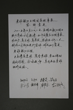專家們在集體品評了柔雅“枝江王”和柔雅“百年枝江”后,給予了這兩大單品很高的評價。中國釀酒大師、中國白酒專家委員會專家賴登燡先生當場揮毫寫下“韻雅香遠”,還送給枝江酒業(yè)幾幅楹聯(lián):一枝清流融江水,千載風雅醉華夏;枝頭明月清輝籠乾坤,江上春風香醇流千載。行云流水的行草,蒼勁中有清秀,灑脫中有內斂。無論是內容還是筆墨,都與枝江酒的風格相一致,表達了與會專家對枝江酒業(yè)的深情厚誼。